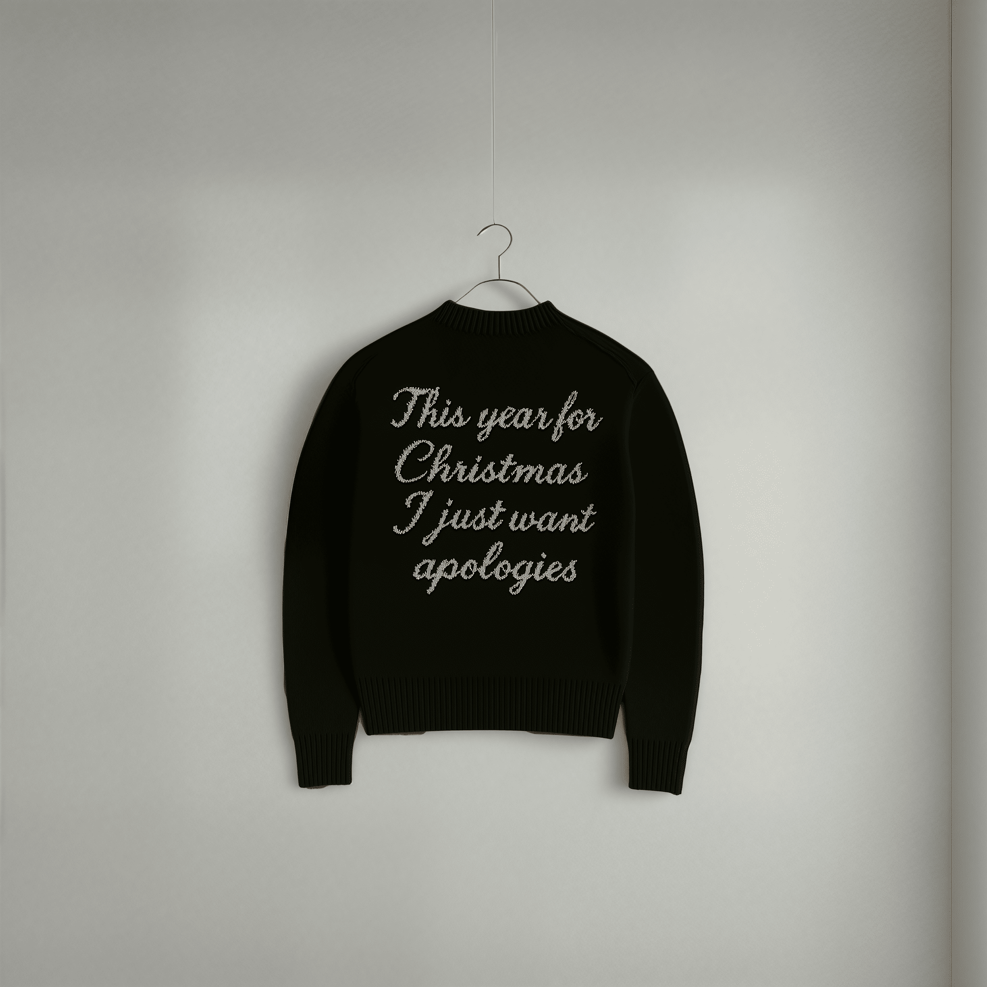 The Apologies wool statement sweater reinterprets sentiment through craftsmanship.