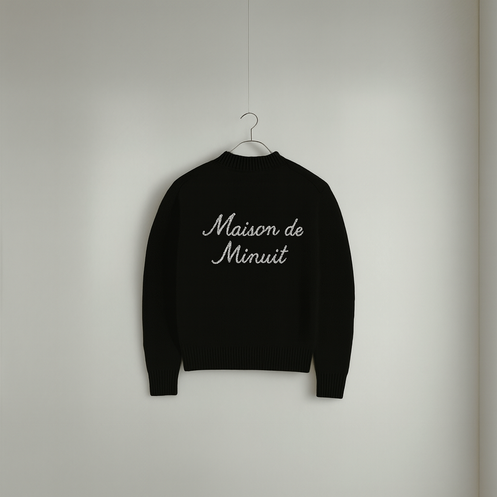 A hand finished knit woven in deep noir wool for the cold night of December.